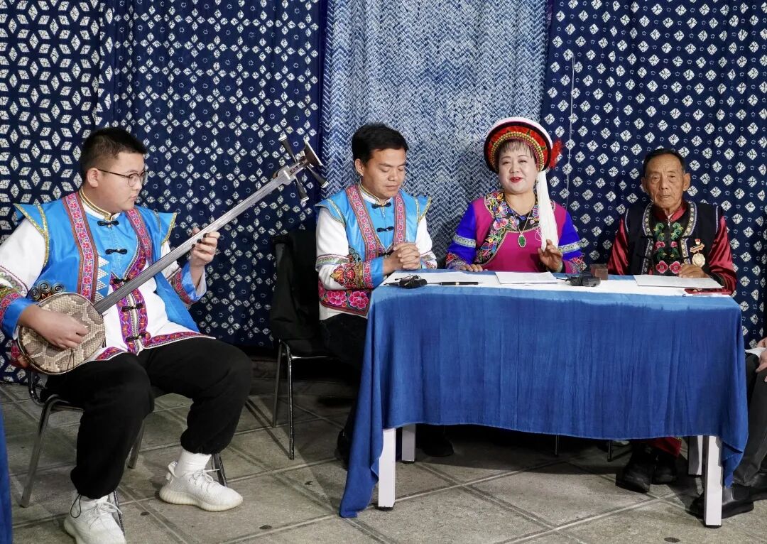 正当人们沉醉于精美的扎染技艺时,直播间迎来了第二个环节——大本曲展演。白族绕三灵国家级代表性传承人赵丕鼎先生,同时也是著名的民间大本曲艺人,他向主持人介绍:大本曲唱腔分为南腔、北腔、海东腔三大艺术流派,有三腔、九板、十八调。赵丕鼎老人连同女儿赵冬梅、儿子赵福坤一同将大理的国家级非遗代表性项目写成了唱词,在大三弦州级代表性传承人李诚的伴奏下,用大本曲的说唱艺术形式敬献全场。在那充满生活气息和民俗气息的说唱中,人们对大理传统文化的感受更加直观、对大理民族民间艺术的体验更加深刻,似乎真的置身于大理白族传统村落之中,恰逢游春歌舞盛会之时。