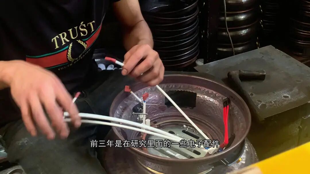 云鹤镇秀邑村铜匠 陈云:“前三年是在研究里面的一些电子原件配件,完工之后又试了一年,完全没有问题之后才上市。最大的难点是发热不均匀,但是经过反复的研究、反复的试验成功了。”