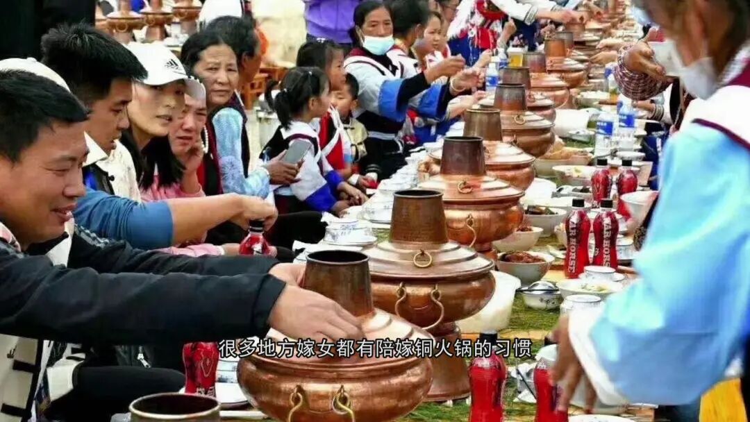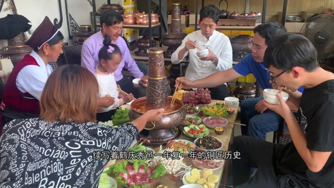 鹤庆的铜火锅非常出名,鹤庆人管它叫“铜锅子”,造型非常独特,原理同烧水锅炉一样,底部烧火,中间架锅,粗大的烟囱穿锅直上。在鹤庆,很多地方嫁女都有陪嫁铜火锅的习惯,这除了与这里盛产铜矿外,也和这里众多的能工巧匠也关。