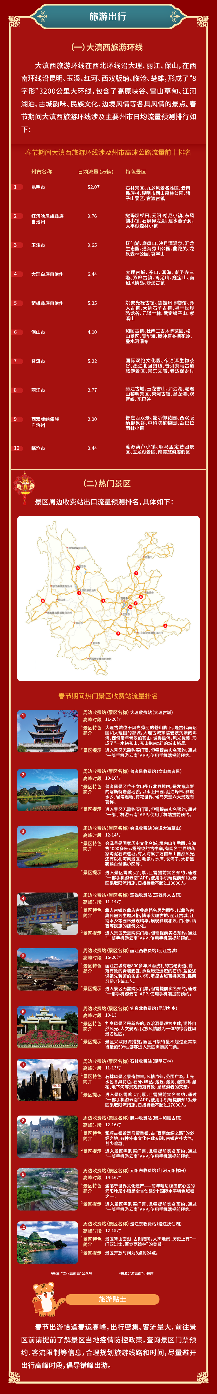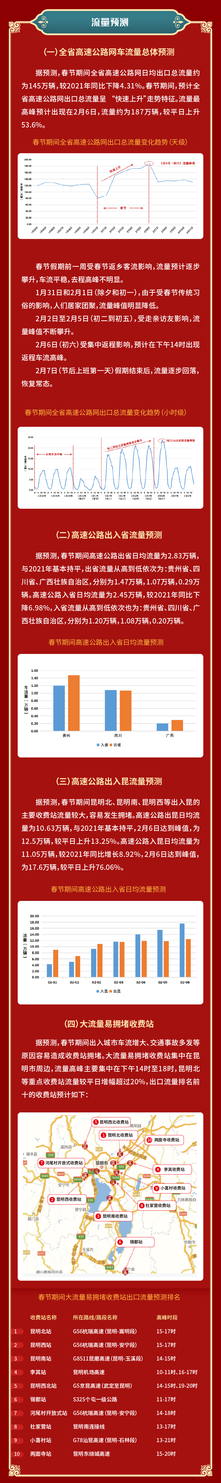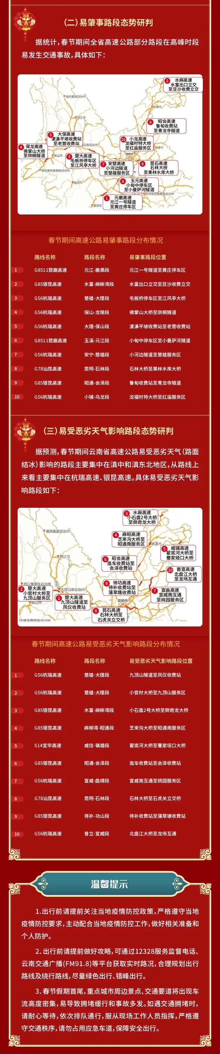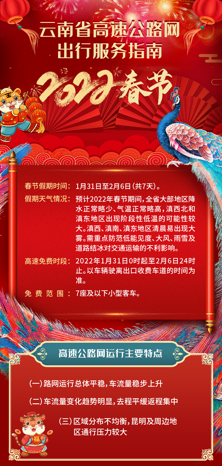 事关春节出行!云南省发布重要提示 2022-01-29 08:26 云南省交通运输厅 0 还有几天就到春节了 近日 云南省交通运输厅发布了 云南省高速公路网出行服务指南 哪些服务区/停车区暂停服务? 哪些收费站易拥堵? …… 一起来看 来源 云南省交通运输厅 责编 童文文 审核 邱忠文