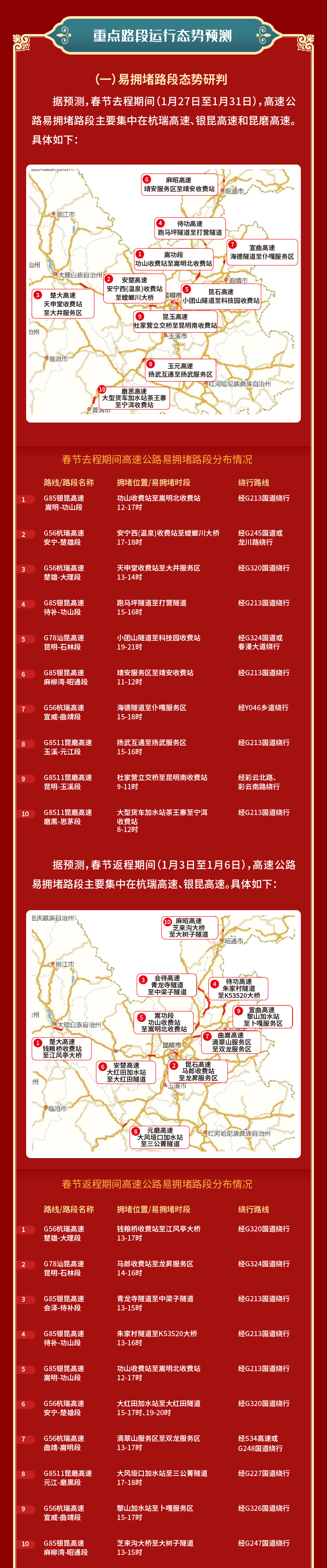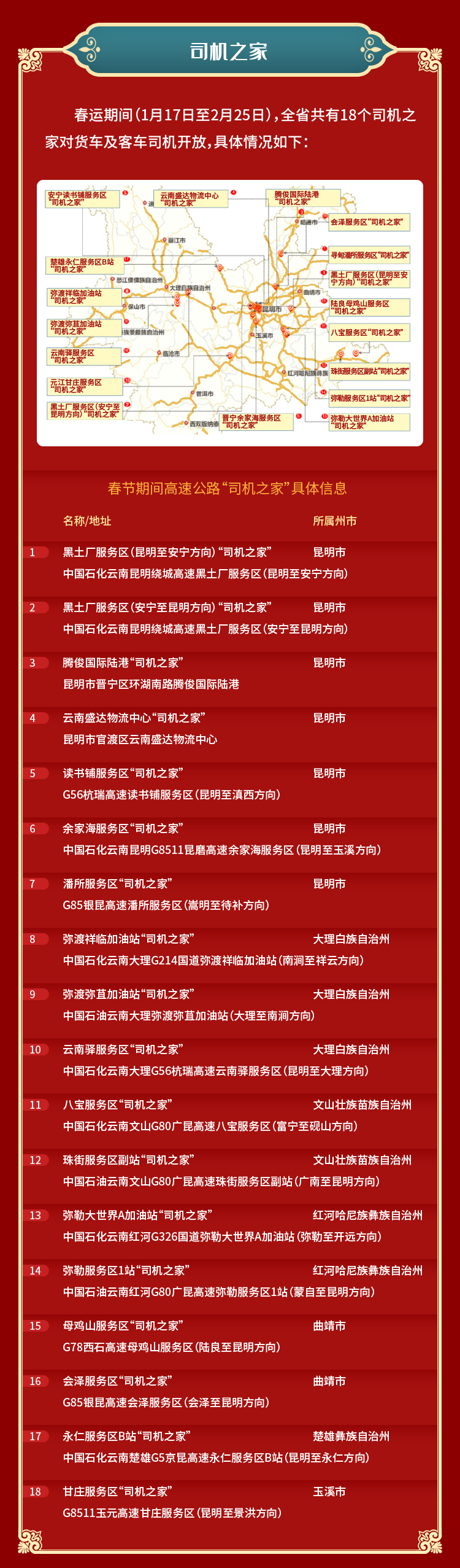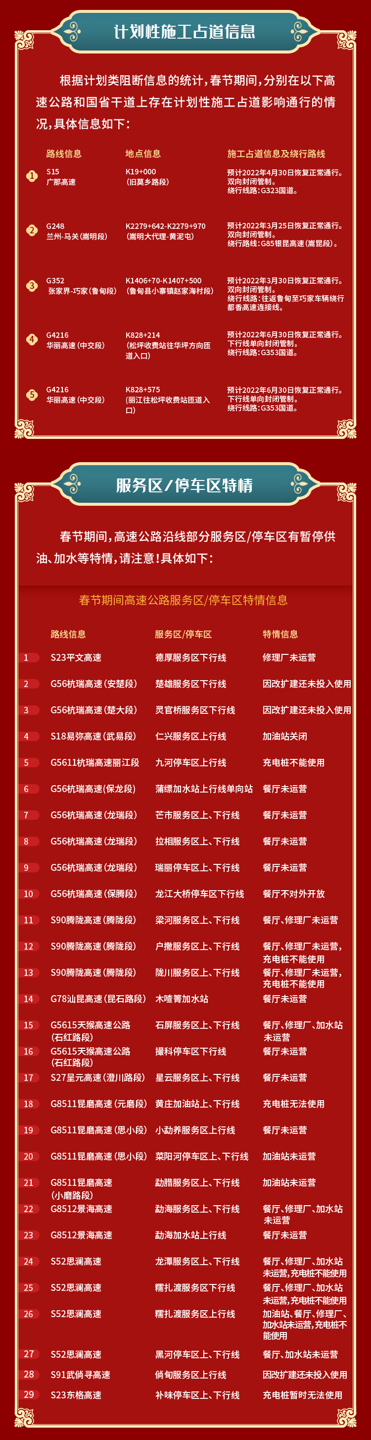事关春节出行!云南省发布重要提示 2022-01-29 08:26 云南省交通运输厅 0 还有几天就到春节了 近日 云南省交通运输厅发布了 云南省高速公路网出行服务指南 哪些服务区/停车区暂停服务? 哪些收费站易拥堵? …… 一起来看 来源 云南省交通运输厅 责编 童文文 审核 邱忠文