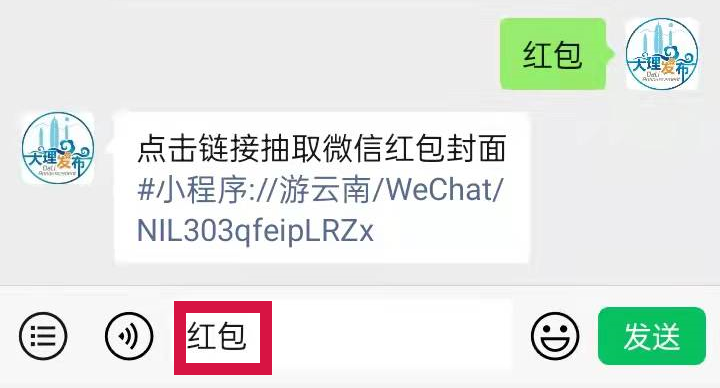 在“大理发布”微信公众号底部聊天对话框(点击底部最左边小键盘标志图片)输入“红包”然后点击“发送”即可获取链接有概率抽取到精美红包封面(每人限抽取一次)
