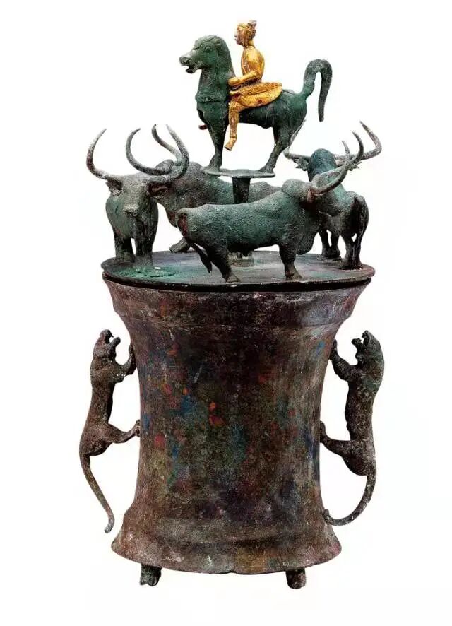 古滇国,有虎耳的贮贝器较多,有鎏金骑士贮贝器、诅盟场面贮贝器、八牛虎耳贮贝器、动物搏斗场面贮贝器等。