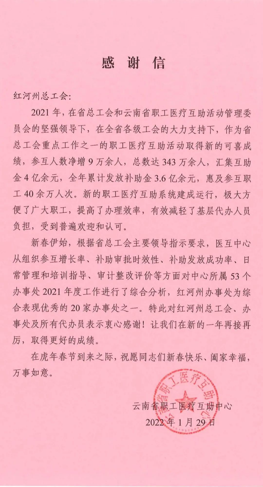 新春来临之际,红河州总工会收到一封来自云南省职工医疗互助中心的来信。这封信肯定了红河州各级工会过去一年的职工医疗互助工作成果,也让红河州各级工会对新一年工作充满了干劲和信心!
