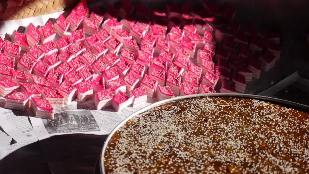 把加了薄荷、橙皮的红糖和白米碾成粉末