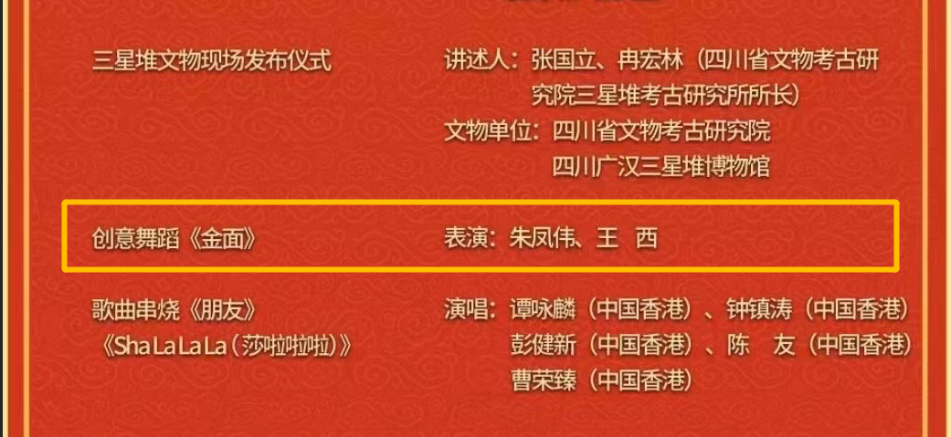 除夕夜,中央广播电视总台春节联欢晚会上,杨丽萍编导的创意舞蹈《金面》亮相,由舞者大朱、王西表演。