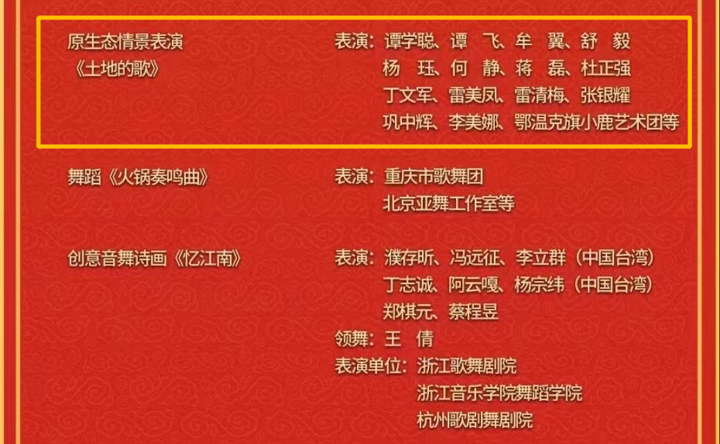 除夕夜,中央广播电视总台春节联欢晚会上,杨丽萍任总编导的民族音乐剧《阿鹏找金花》阿鹏的扮演者“白族大本曲”传承人张银耀和13名来自《阿鹏找金花》音乐剧里的云南各民族演员线小团、李王丹、林怡倩、赵之瑄、李雅洁、斯那永追、张小燕、陈丽春、张慧、晏超超、王湑、李丽、李润月,在原生态情景《土地的歌》节目中,表演大理剑川白族调和龙头三弦歌舞。