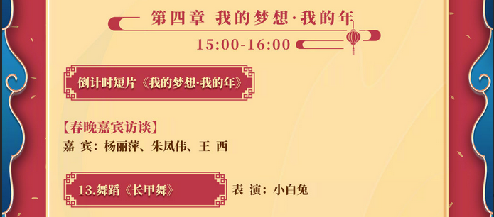1月31日下午15:00——16:00,中央电视台三套《春晚倒计时》播出杨丽萍任编导的民族舞蹈《长甲舞》全版。由杨丽萍侄女白兔(陈璇)表演。