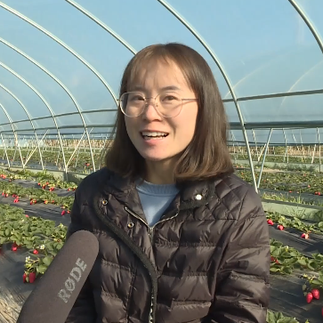 草莓采摘游客刘溦琳:“前几天一直在下雨,刚好今天天气晴,我就赶紧约几个好朋友来摘草莓,今天的草莓特别好,又红又大,我们大家都摘得很开心。”