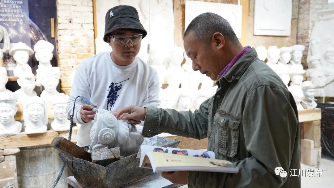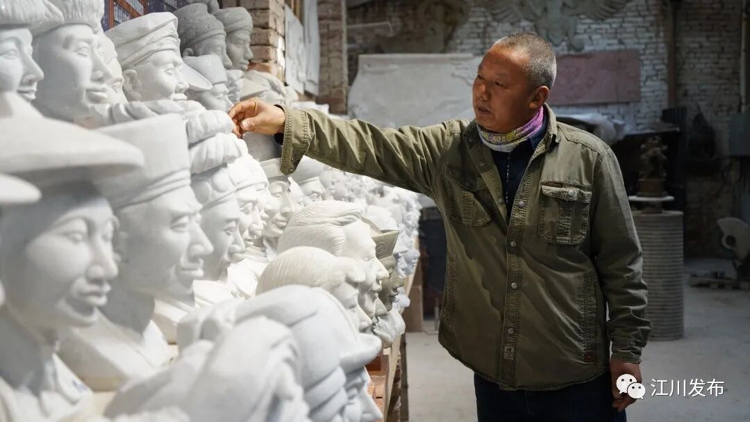 走进玉溪市江川区江城镇云龙雕塑工艺厂,记者看到,白色的民族石雕头像整齐地排列在木柜上,每一个民族石雕头像的大致轮廓均已成形,付云龙和儿子正在认真地对石雕头像的细节作细致的打磨。