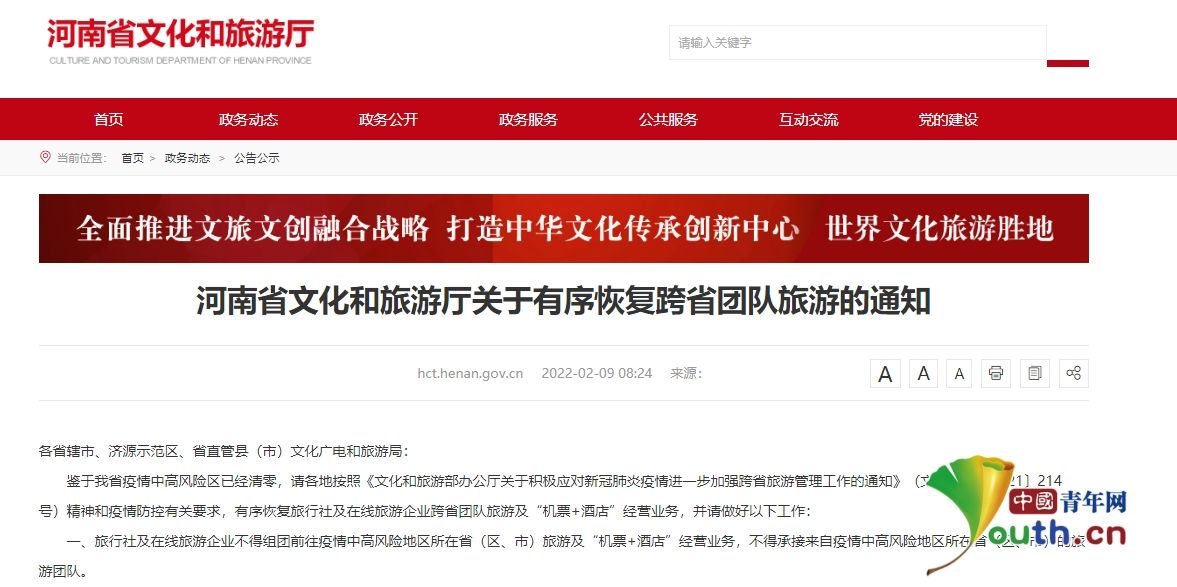 2月9日,河南省文化和旅游厅发布关于有序恢复跨省团队旅游的通知,明确有序恢复跨省团队旅游。