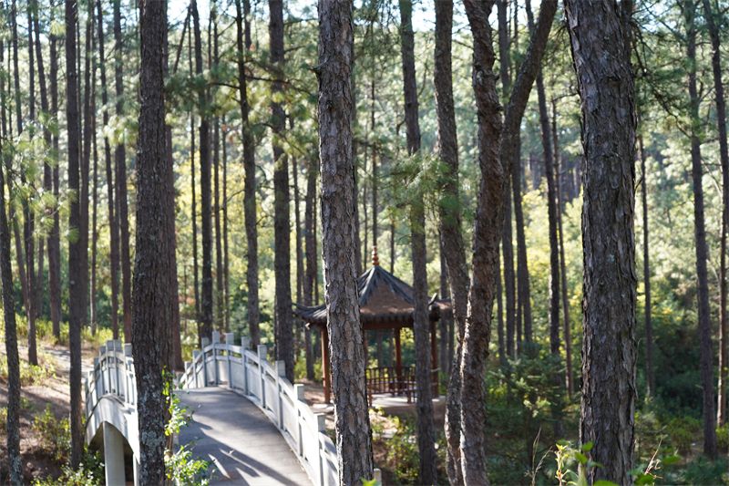 湖边的松林广袤青翠,一眼望不到边际,林间建有休闲步道和休憩用的小亭子,走累了到亭子里坐一会儿,喝上一壶当地的野坝子茶,清香解渴。