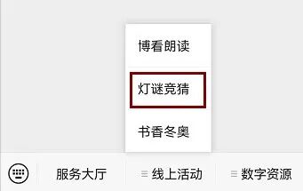 1、关注“玉溪市图书馆”微信公众号,点击底部菜单“线上活动”,选择“灯谜竞猜”进入活动页面。