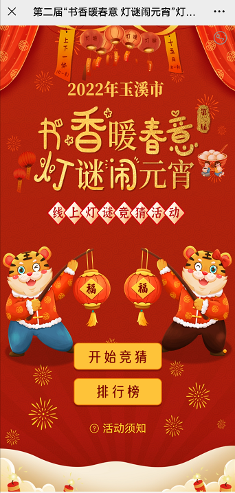 元宵猜灯谜是中华民族传统民俗文娱活动。为加强文明城市创建工作,弘扬中华民族传统节庆文化,丰富市民读者的文化生活,活跃节日气氛,展现读者风采,增强图书馆与读者的凝聚力,营造良好的文化氛围,让读者欢度一个喜庆祥和、欢乐文明的元宵佳节。玉溪市图书馆联合全市各区县图书馆特开展第二届“书香暖春意 灯谜闹元宵”灯谜竞猜活动,欢迎广大读者积极参与。