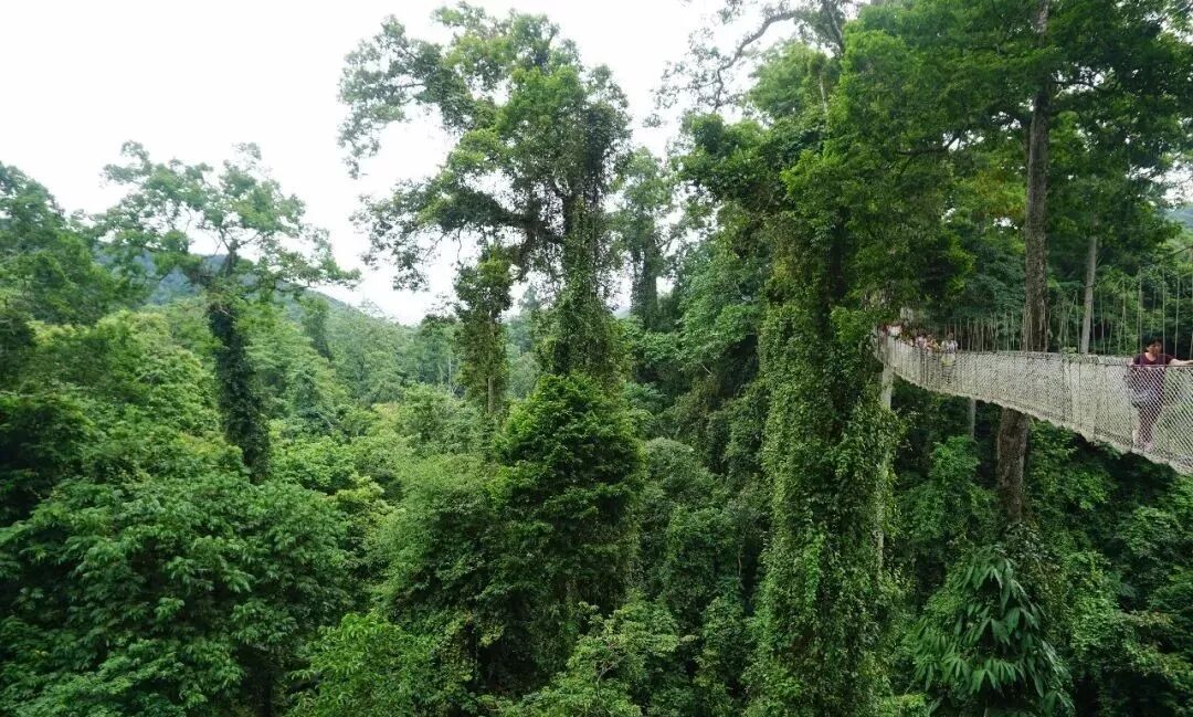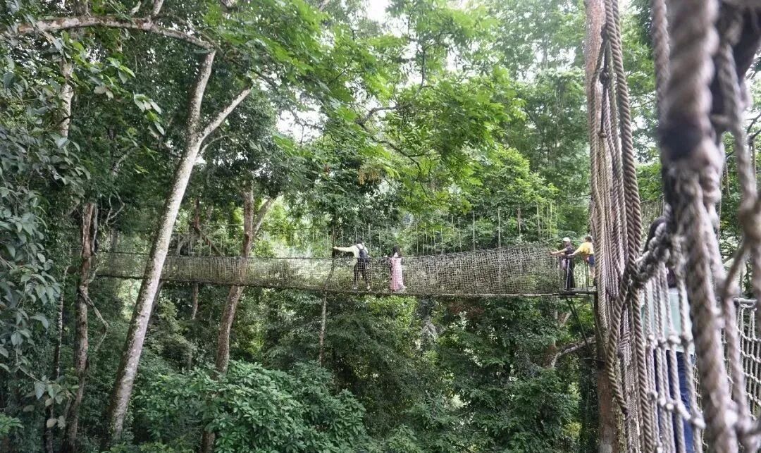 走在树冠走廊之上,以最佳视角,近距离观察大果榕、木奶果、菠萝蜜、无忧花等“花开树梢、果挂枝头”的老茎生花结果现象,看雨林植物争取光和水的适应而产生的附生现象,寻找适者生存的绞杀等雨林奇观。往雨林深处走去,千姿百态的奇花异卉,以浓郁宜人的气味吸引着蜂蝶,并在雨林这片宝地花开四季。游客穿越这座神秘之地,以看、听、问等方式一点点地探索出雨林生态的秘密。