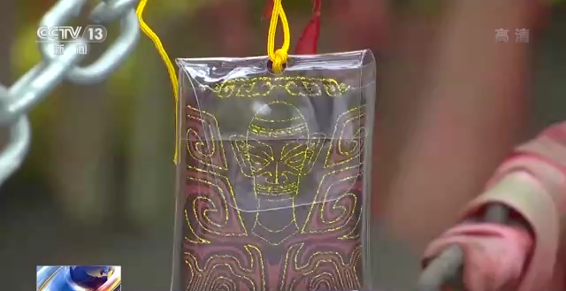 活动中,由游客亲手挂放的福袋,便是三星堆博物馆新推出的文创产品——蜀佑符福袋,刺绣出了三星堆面具和神鸟形象,祈求来年事事顺心。