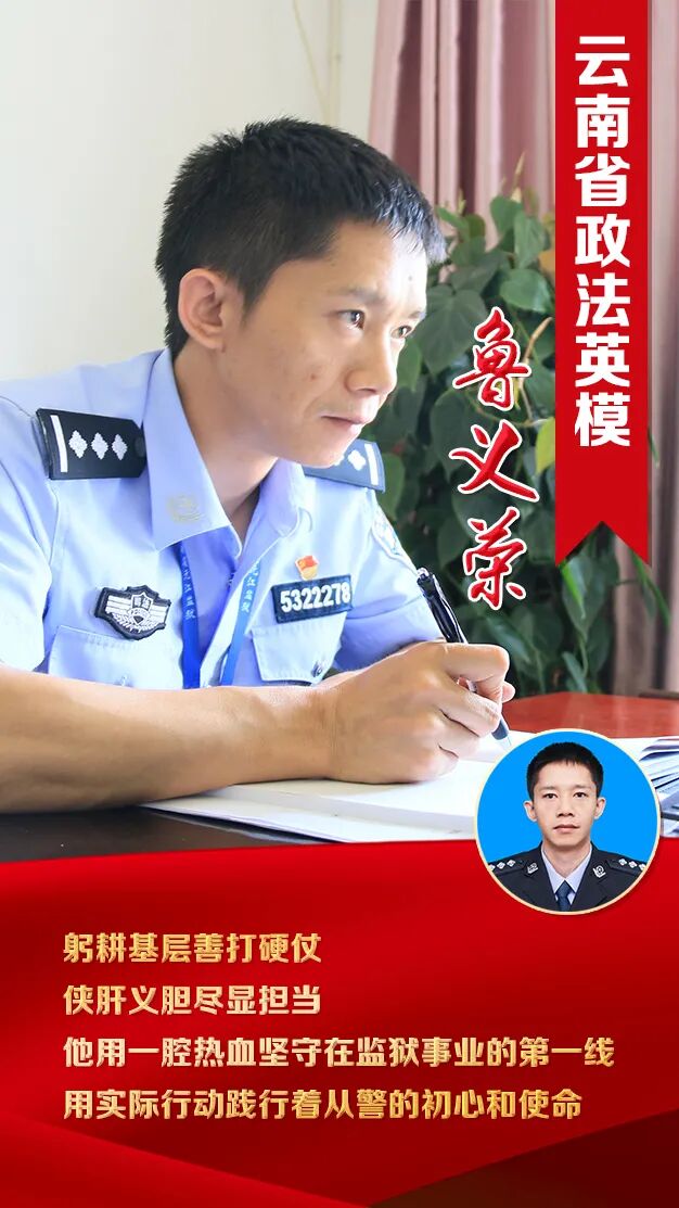 编者按:近日,省委政法委、省人力资源和社会保障厅联合印发《关于表彰云南省政法英模、政法工作先进个人的决定》。云南省元江监狱组织干部科科长鲁义荣同志被授予“云南省政法英模”称号。