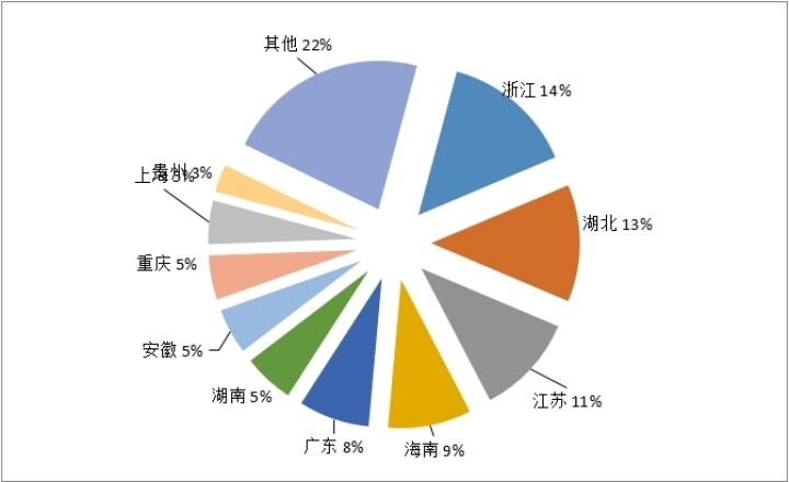 第四季度旅行社国内旅游接待人次排名前十位的地区由高到低依次为浙江、湖北、江苏、海南、广东、湖南、安徽、重庆、上海、贵州(见图2)。