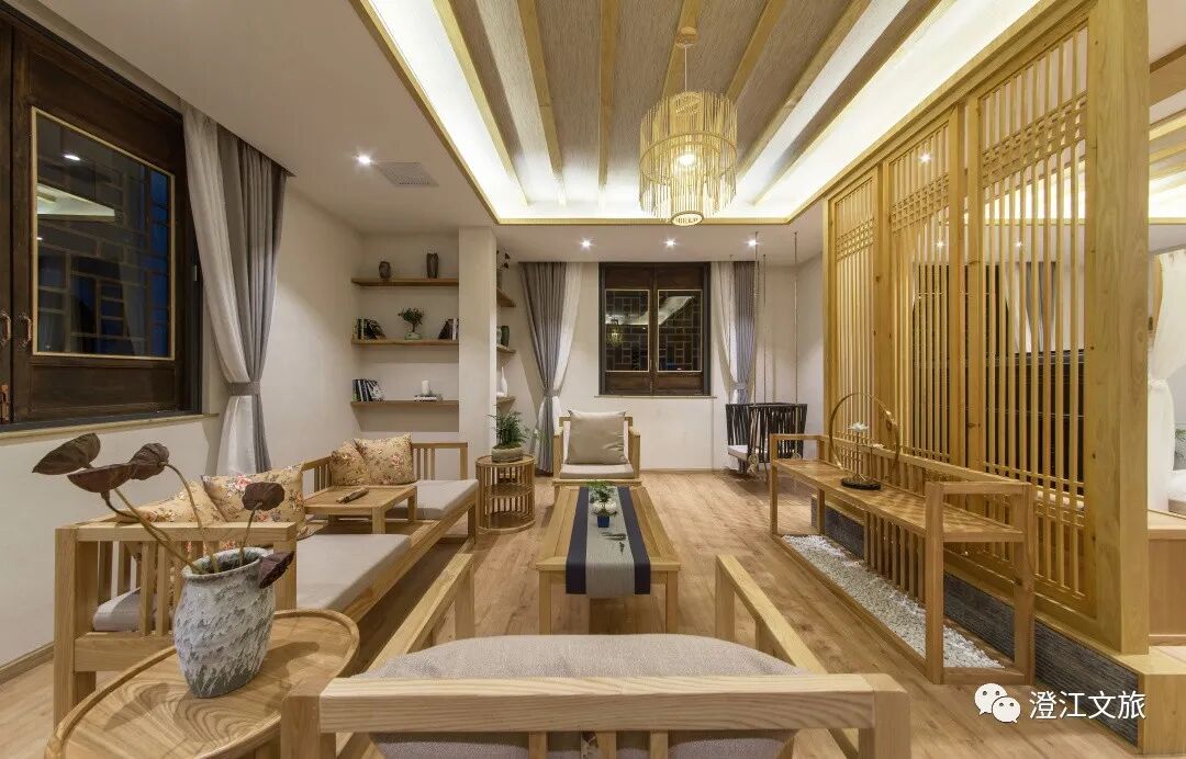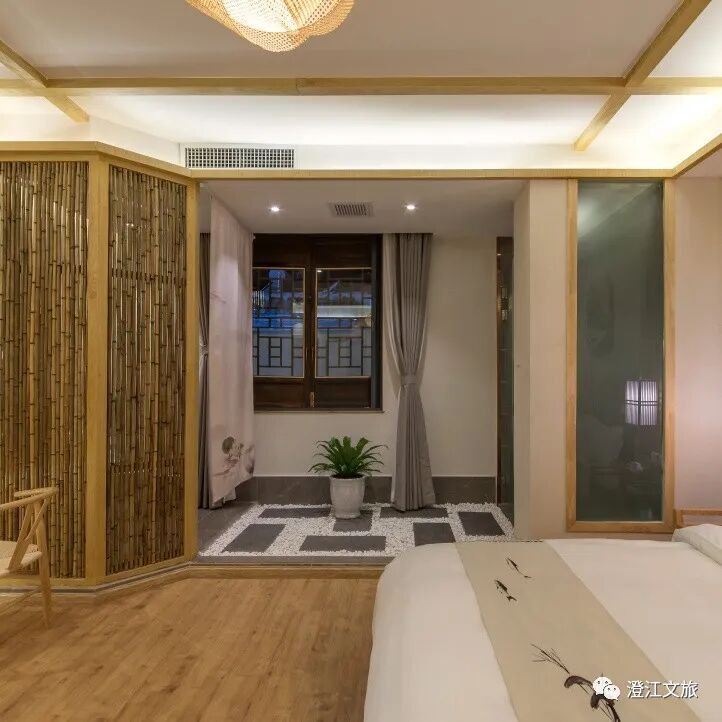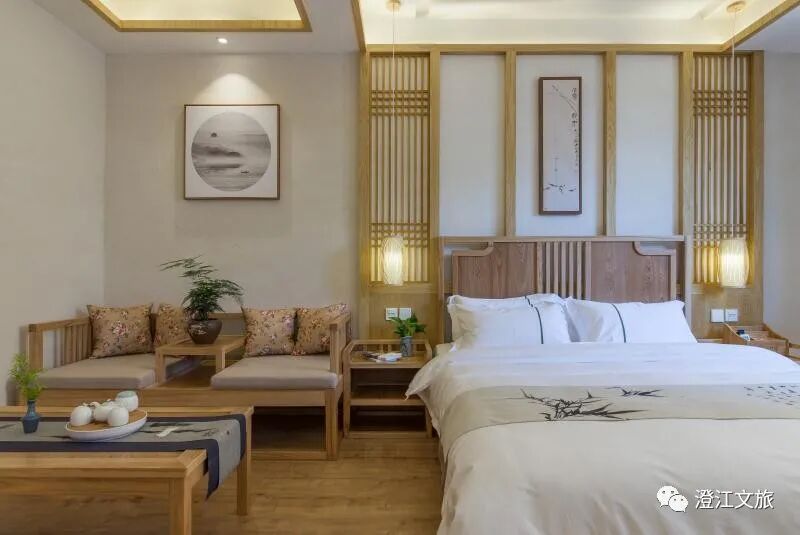 木竹坞共10间房,4间荷景房,6间古村景观房,从卧室装修到室内工艺品摆件设计,围绕“竹”“禅”为主题,都采用原木家具、木质装饰品,竹灯、竹摆件、禅茶具、禅挂画,散发着自然、恬淡的气息。