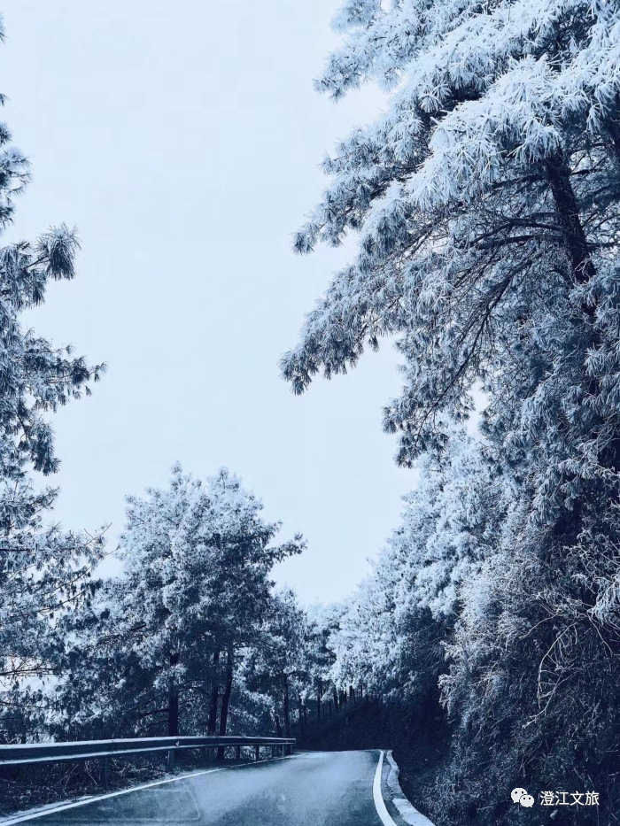 上山的路旁,两排青松装裹着银色,轻轻摇曳着迎接人们的到来。
