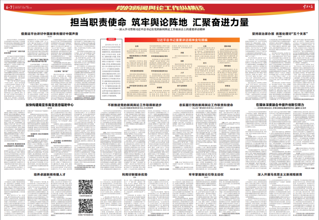 随着数字化进程加快,媒介环境更迭,传播方式变迁,传播格局不断变革,舆论环境纷繁复杂,新闻舆论工作面临新的挑战和机遇。习近平总书记在党的新闻舆论工作座谈会上对党的新闻舆论工作职责使命的重要论述,不仅深刻揭示了新闻舆论工作的“魂”,也深刻阐明了新闻舆论工作的“道”。深入学习贯彻习近平总书记重要讲话精神,必须在牢牢坚持党性原则,坚持正确舆论导向的基础上,积极把握舆论规律,学好用好新技术,不断深化媒体融合,加强舆论治理和引导,推动主流媒体的新闻舆论传播力、引导力、影响力、公信力不断增强,让主流舆论更有力,让舆论环境更聚力,作为有多种优势的云南,应加快构建南亚东南亚信息辐射中心。