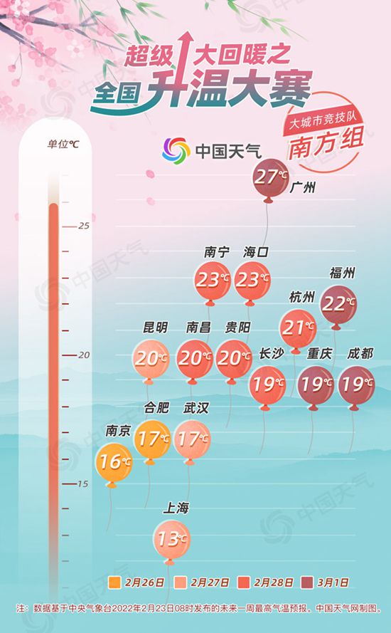 26日之后,南方多地气温将陆续创今年以来的新高,南昌、杭州、贵阳、昆明、福州、广州的最高气温都将达到20℃以上。本周末到下周初,南方大部将呈现出一幅春意盎然的景象,比起前几天的湿冷雨雪天气,可能有“一夜跨季”的穿越感。