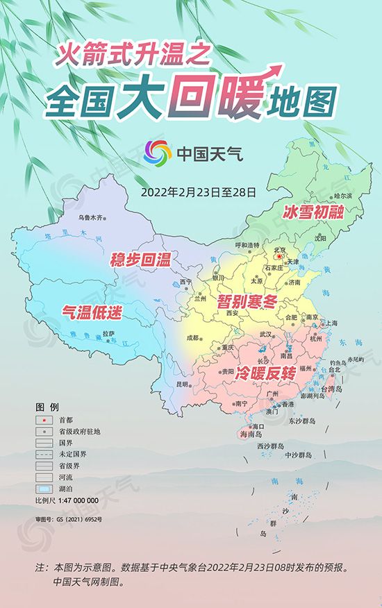 中国天气网推出的“全国大回暖地图”显示,24日至28日,东北地区的气温将稳步回升,三个省会城市的最高气温将回到冰点以上,大地回暖、冰雪初融;北京、天津、河北、陕西、山西、山东、河南一带也将大踏步升温,最高气温将突破10℃,暂别寒冬;江南、华南将经历冷暖反转,多地气温大跃进至20℃以上,江南一带甚至可能就此开启入春进程。