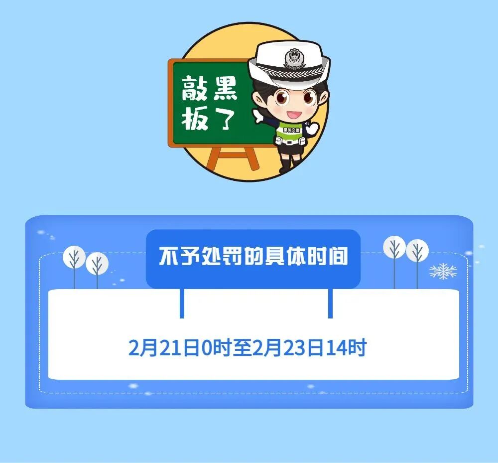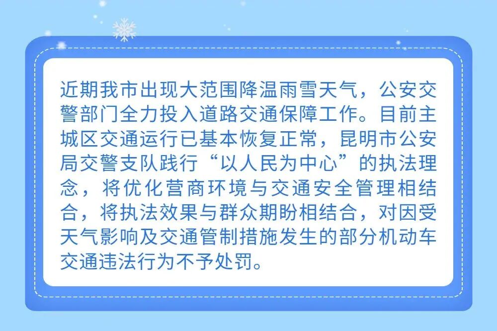 不处罚!刚刚,昆明交警发布重磅消息 2022-02-23 19:55 昆明交警 0 2月23日 昆明交警发布消息 对2月21日0时至23日14时 因雨雪天气影响,道路通行条件受限 在驾车过程中发生的 占道、压线、临时停车等交通违法行为 一律不予处罚! 来源:昆明交警 责编 龚怡丹 审核 李元