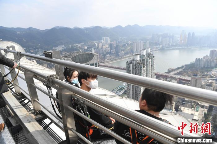2月23日,重庆渝中区一高楼上的高空游览项目吸引游客前来体验“云中漫步”。游客可以在上面俯瞰两江盛景,感受魔幻山城的独特魅力。