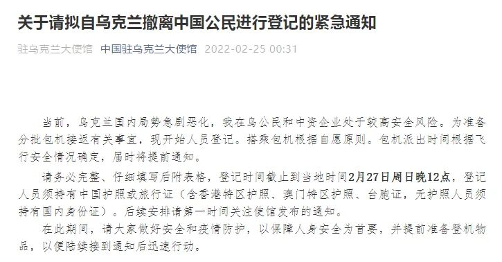 2月25日,中国驻乌克兰大使馆发布《关于请拟自乌克兰撤离中国公民进行登记的紧急通知》,通知全文如下: