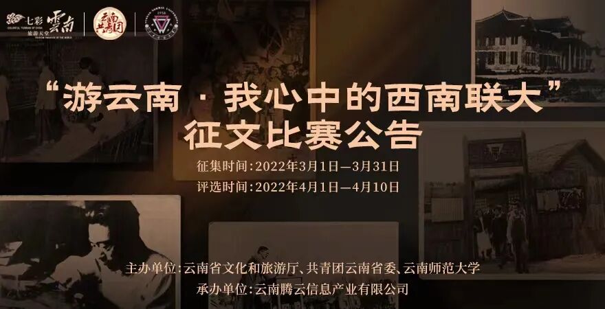 为贯彻落实习近平总书记考察云南重要讲话精神,讲好西南联大故事,打造文旅融合新亮点,云南省文化和旅游厅、共青团云南省委、云南师范大学将共同举办“游云南·我心中的西南联大”征文比赛,现将有关事项公告如下。