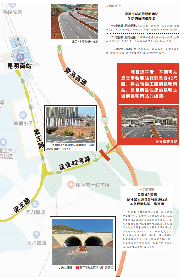 记者3月1日在呈贡42号路(黄马高速呈贡南立交联络线,接梁王路)现场看到,该路段1.6公里长的6车道快速路、380米小尖山隧道和呈贡南收费站已经建成,仅剩绿化、路灯、电缆、桥梁伸缩缝尚未完工。据施工单位中铁二十四局现场施工人员介绍,呈贡42号路预计上半年启用。据悉,呈贡南收费站离昆明南站1.2公里,从主城区进入昆石高速,在小团山立交转入黄马高速,到呈贡南收费站下,这是昆明主城区前往昆明南站最快捷线路。