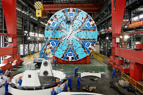 (2020年10月15日,在隧道股份上海隧道工程有限公司机械制造分公司生产车间,工人对“骐跃”盾构机进行安装调试。新华社记者 方喆 摄)