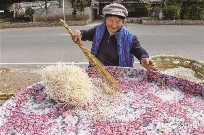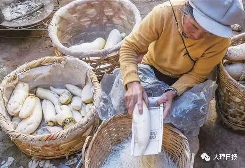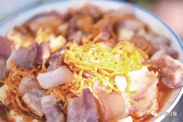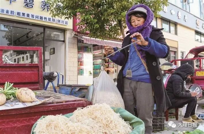 家住剑湖东面禄寿村的杨进年,今年69岁,是为数不多的还在做干萝卜丝的老人。她告诉我们,年轻的时候,农村里家家户户都做干萝卜丝。干萝卜丝主要用于做腌肉、猪肝胙等食用腌制品的配料,也单独跟辣椒一起腌制。在萝卜丝上面蒸几片剑川传统半腌干的五花肉,肉吃起来肥而不腻,萝卜丝则香脆可口。
