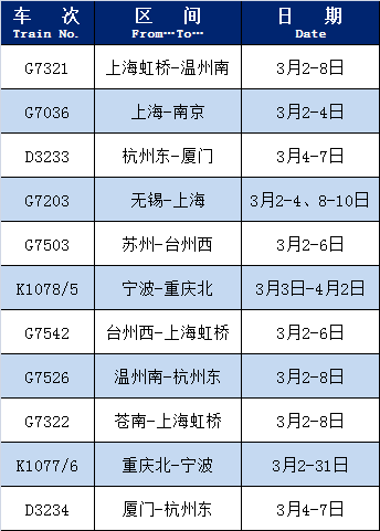 长三角铁路部分车次陆续恢复增开 2022-03-03 14:11 央视新闻客户端 0 为满足旅客出行需求,长三角铁路部分车次陆续恢复增开。增开列车车次及时间以铁路12306网站和车站公告为准。 来源 央视新闻客户端 责编 沈梦玲 审核 邱忠文