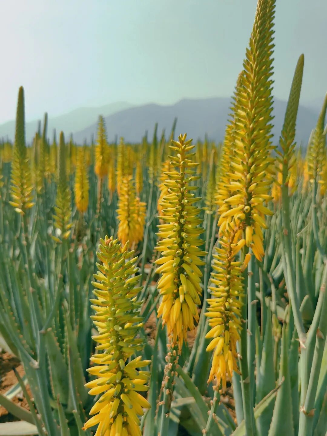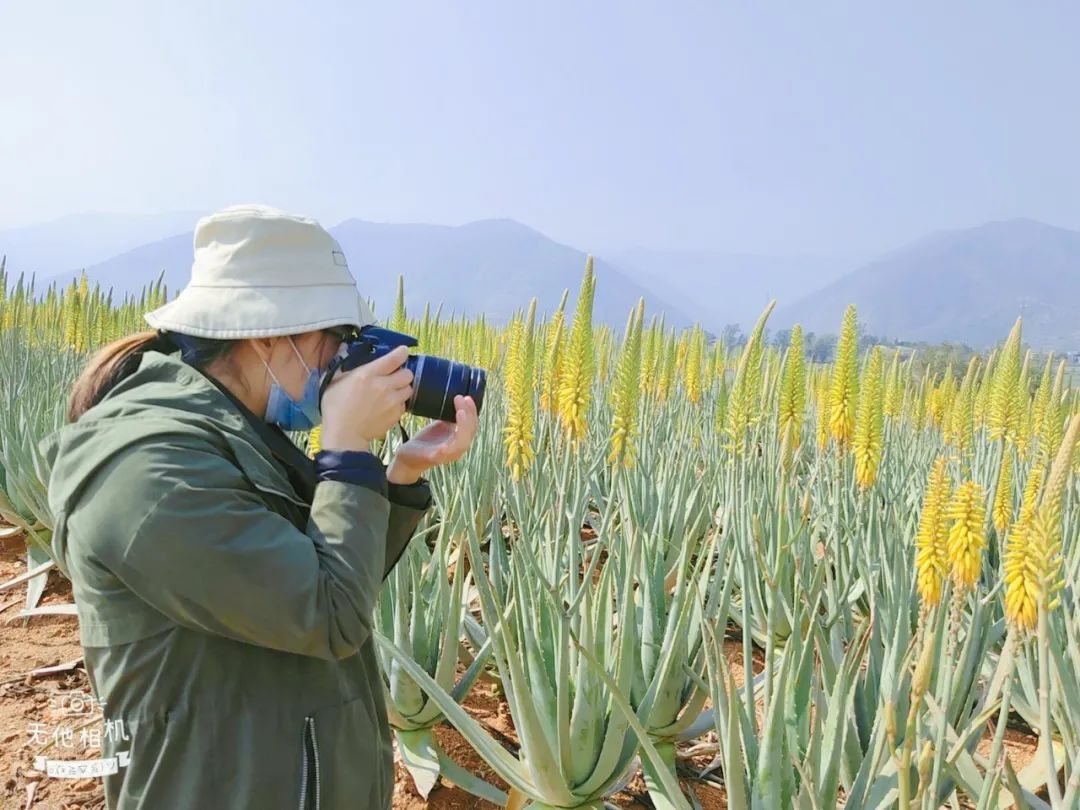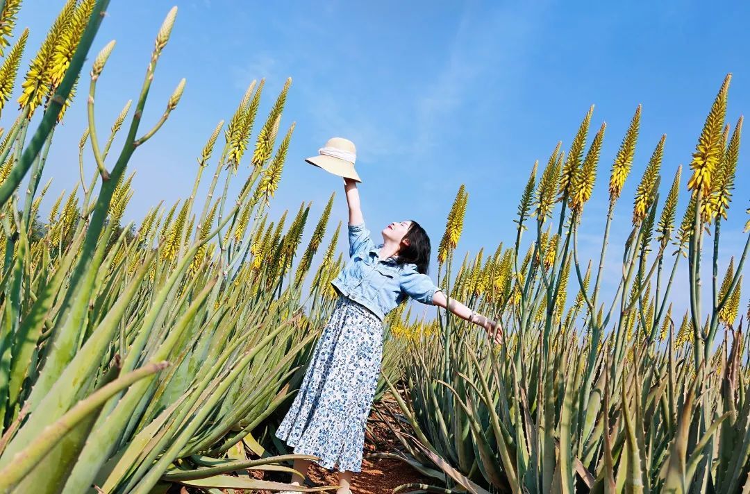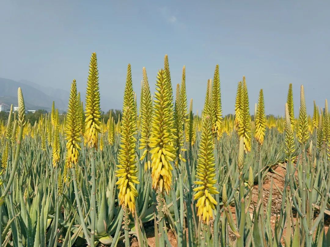 穿梭于万亩芦荟花海,蔚蓝的天空,清新的空气,看金色的阳光洒在花瓣上,微风吹过,花海起此彼伏,仿佛在弹奏春日里最美的乐章,风景如画,让人流连忘返。