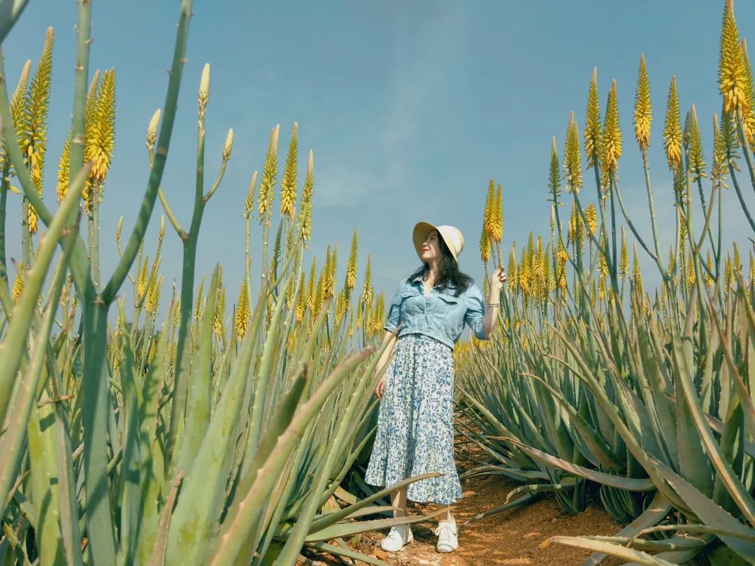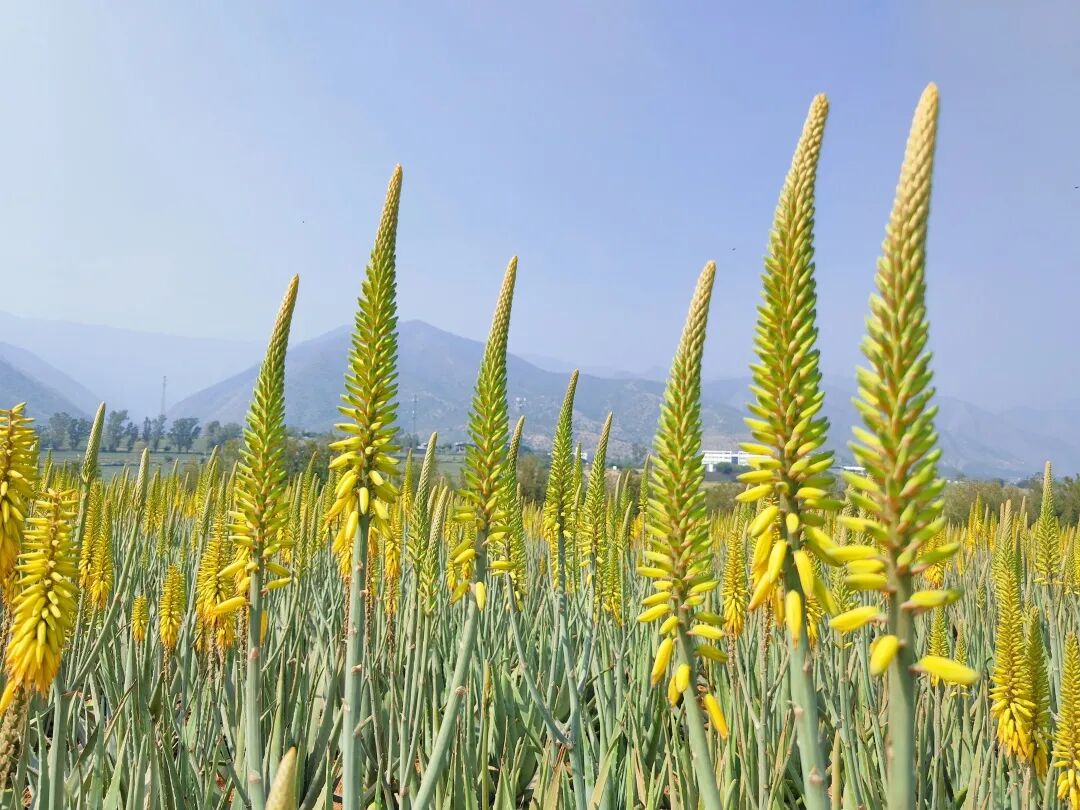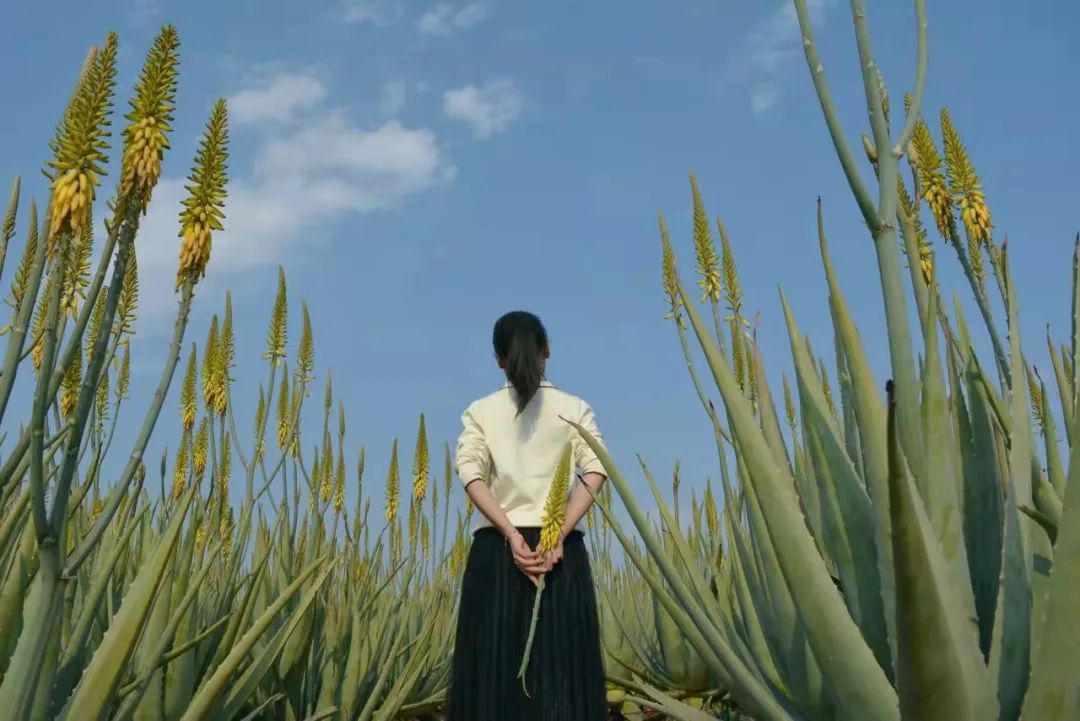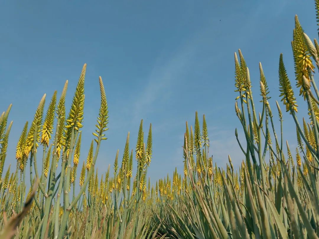 穿梭于万亩芦荟花海,蔚蓝的天空,清新的空气,看金色的阳光洒在花瓣上,微风吹过,花海起此彼伏,仿佛在弹奏春日里最美的乐章,风景如画,让人流连忘返。