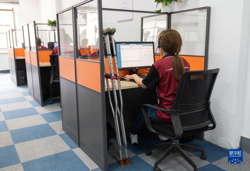 在北京圆通速递助残基地暨北京共享客服中心,一名残疾人员工在工作(2021年5月16日摄)。新华社记者 才扬 摄