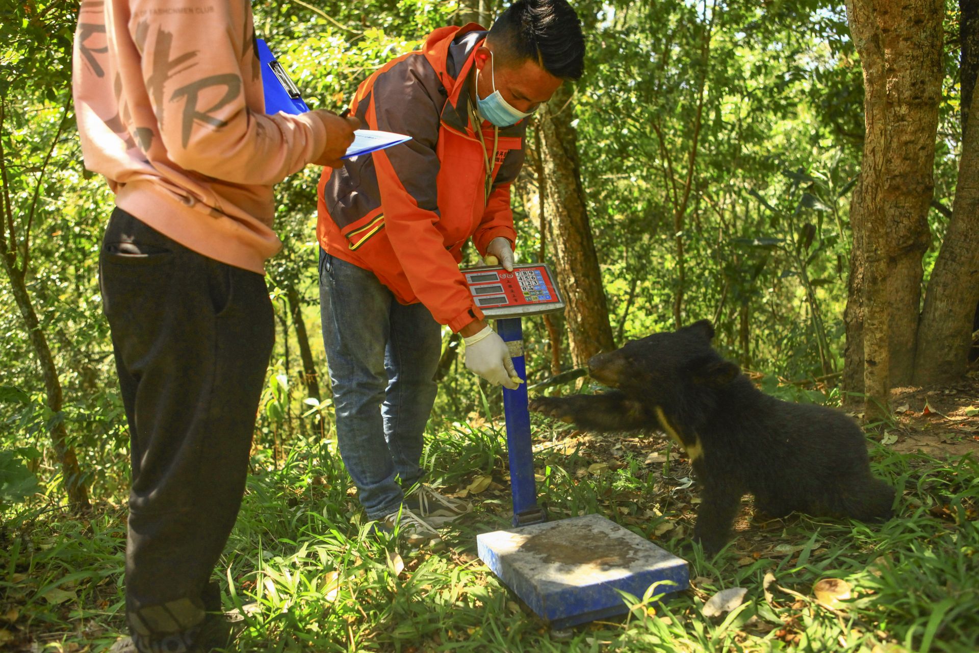 而小黑熊最调皮,一心只想爬上树睡觉,不管动物观察员如何耐心叫唤,它都无动于衷。最后用了一瓶蜂蜜,很多苹果,才将三只黑熊的体重、身高等数据记录下来。