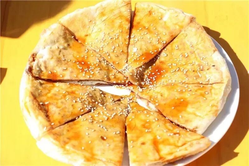 火烧的大粑粑,形似馍但更为松软,足有盘子大小,因发酵而产生大量气体,厚度通常超过一指节,口感类似华夫饼,但一般做咸口来吃,涂上当地的玫瑰色腐乳,在辣味刺激下更能显现出麦面的醇香。当然也有油香,小面饼子被抛进宽油大锅之内,瞬间鼓胀成一个小小气球,浓香酥软。既然说到油香,就不得不说树皮,本地人给食物取名随意到令人咂舌,一块酥油面经过油炸,表面酥松到炸裂,形似皲裂的树皮,便以此命名,口感与麻花差不多,但更加酥松,虽然肉眼就能直观感受到“碳水炸弹”的威胁,但谁又能拒绝这令人身心愉悦的满足感呢?