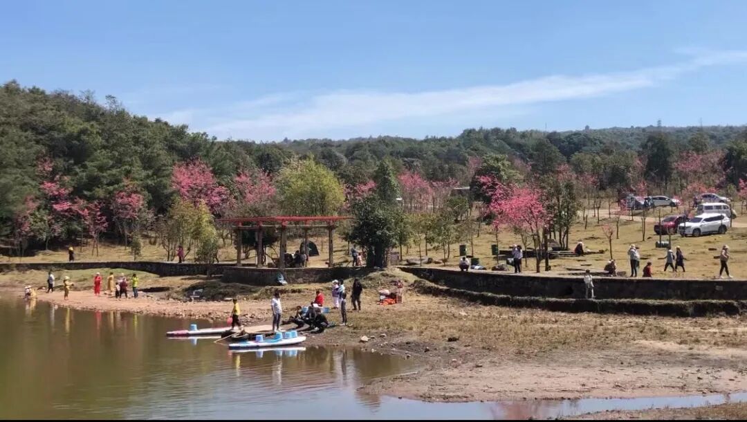 阳春三月,万物复苏,百花齐放。眼下,新平县磨盘山国家森林公园已悄悄穿上粉装,万亩樱花遍布山野,花团锦簇,一朵朵樱花正开得绚烂肆意,向人们捎去春的讯息。游人们如约而至,赏樱花、寻美食,共赴这场春天的约会。