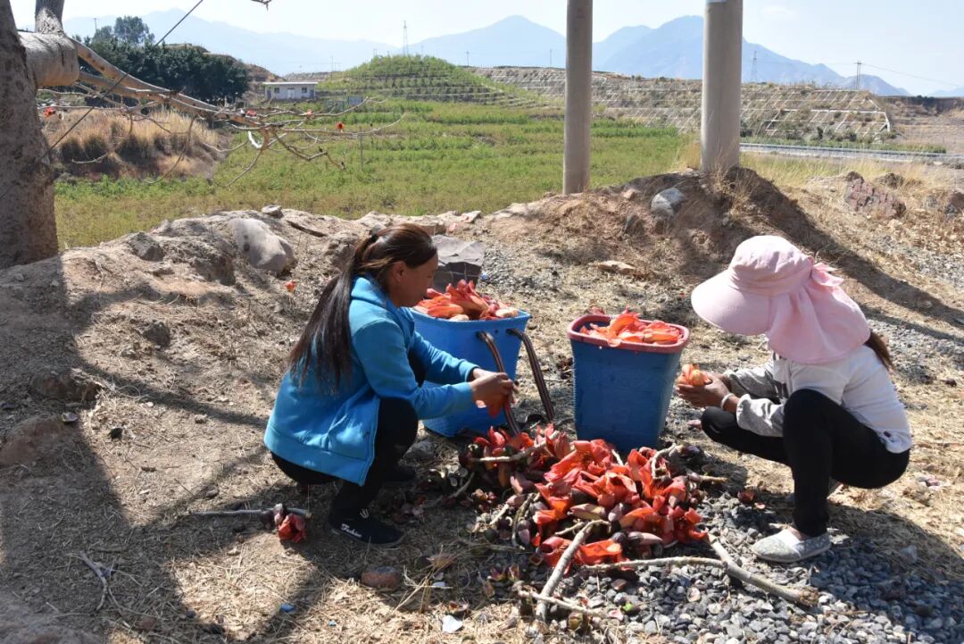 攀枝花树下,许多人正在捡拾成熟后自然掉落的攀枝花,将这些大自然的丰厚馈赠收入篮子当中,带回家保存、加工,最后做成攀枝花菜、攀枝花宴。