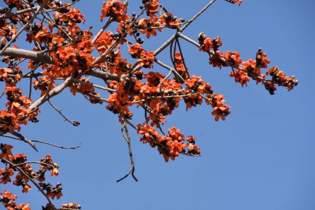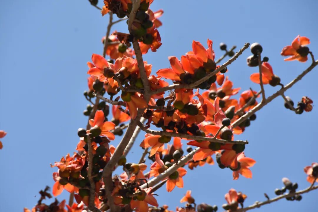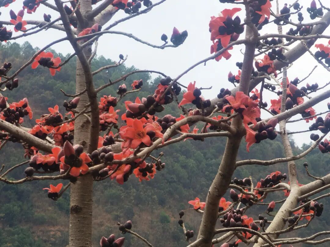 日前,在永胜县的涛源、片角、期纳等沿金沙江畔乡镇,红红的攀枝花正开得热烈,一树树、一簇簇、一丛丛,花开正艳,雍容华丽的攀枝花,有的含苞欲放,有的绚丽绽放,如一团团红焰,跃然于枝头,菲红一树,红得热烈、红得大气、红得奔放。一株株高大虬劲的攀枝花,点缀在原野,把江畔、山野浸染得春机盎然。