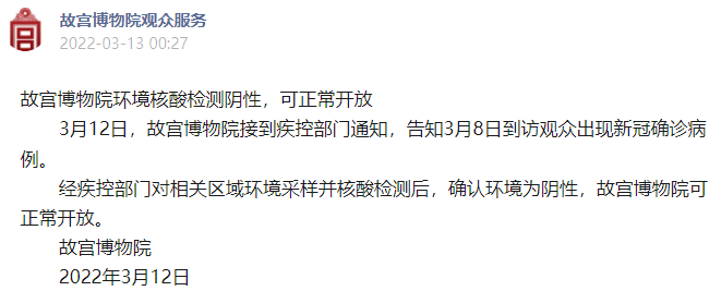 经疾控部门对相关区域环境采样并核酸检测后,确认环境为阴性,故宫博物院可正常开放。