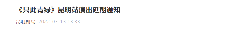 感谢您一直以来对昆明剧院的关注与支持,我们抱歉地通知您,鉴于近日昆明市出现新冠肺炎本土病例,经请示属地疫情防控相关管理部门,为切实保障广大观众及演职人员的身体健康与生命安全,根据相关部门意见,主办方审慎研究决定,将对3.17-3.19日演出舞蹈诗剧《只此青绿》——舞绘《千里江山图》进行延期处理。
