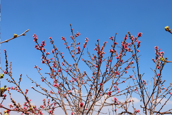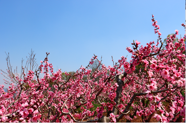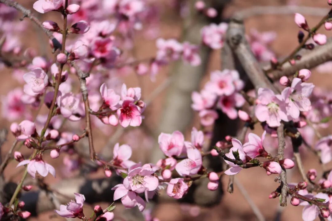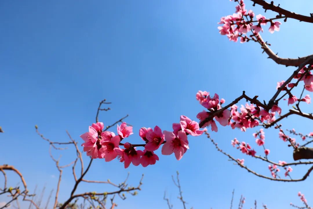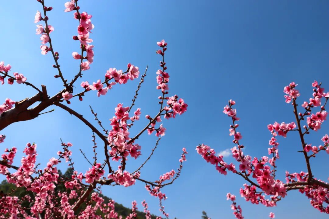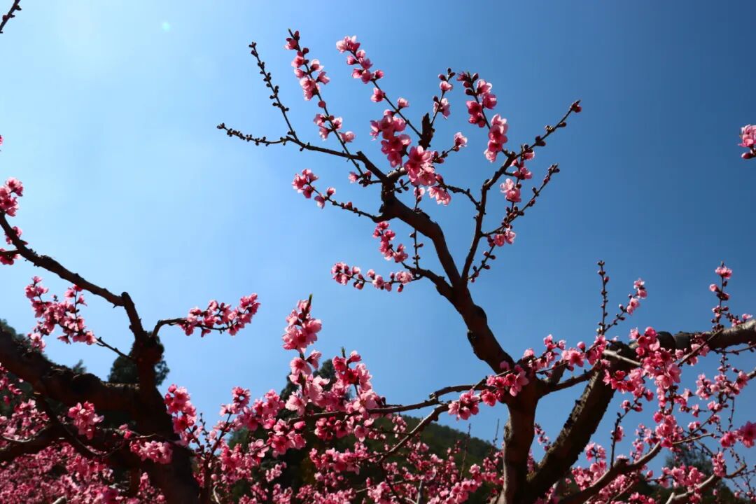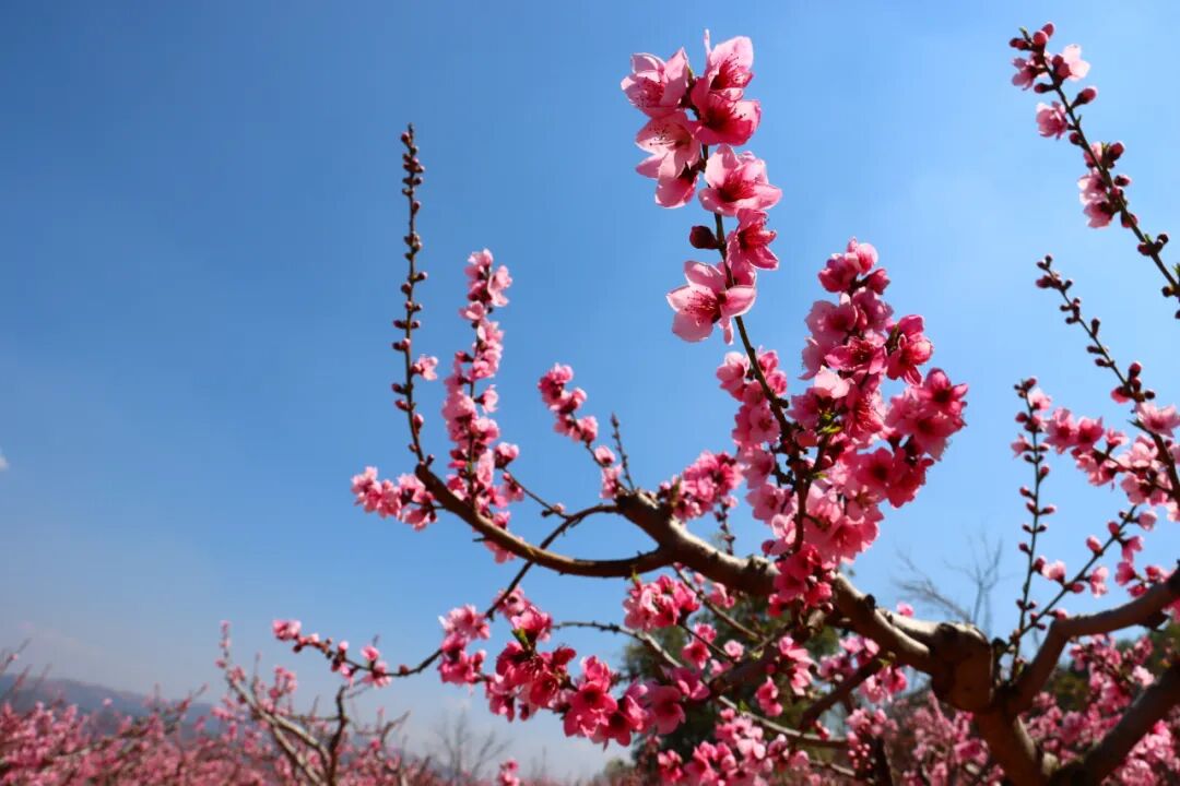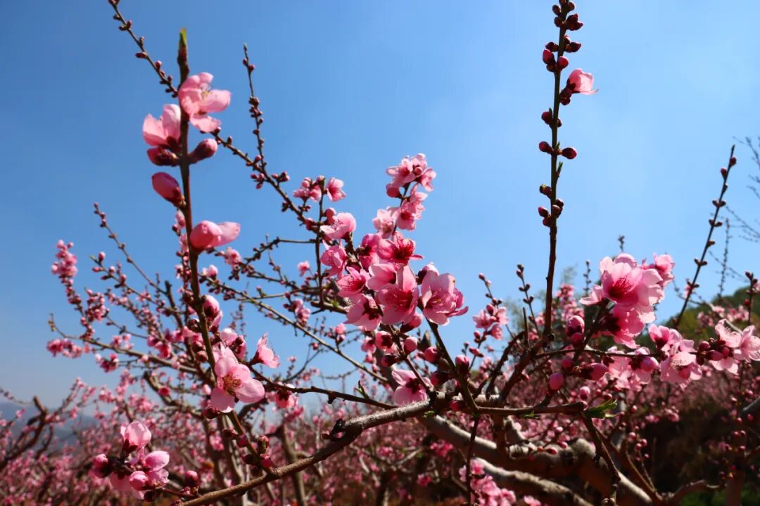 穿行在桃林里的赏花小道上,仿若置身在一片粉红色的海洋里,目之所及皆是昂扬盛开的桃花。每一棵树,每一根枝上都挂满了花朵,密密麻麻压得枝芽也弯下了腰。