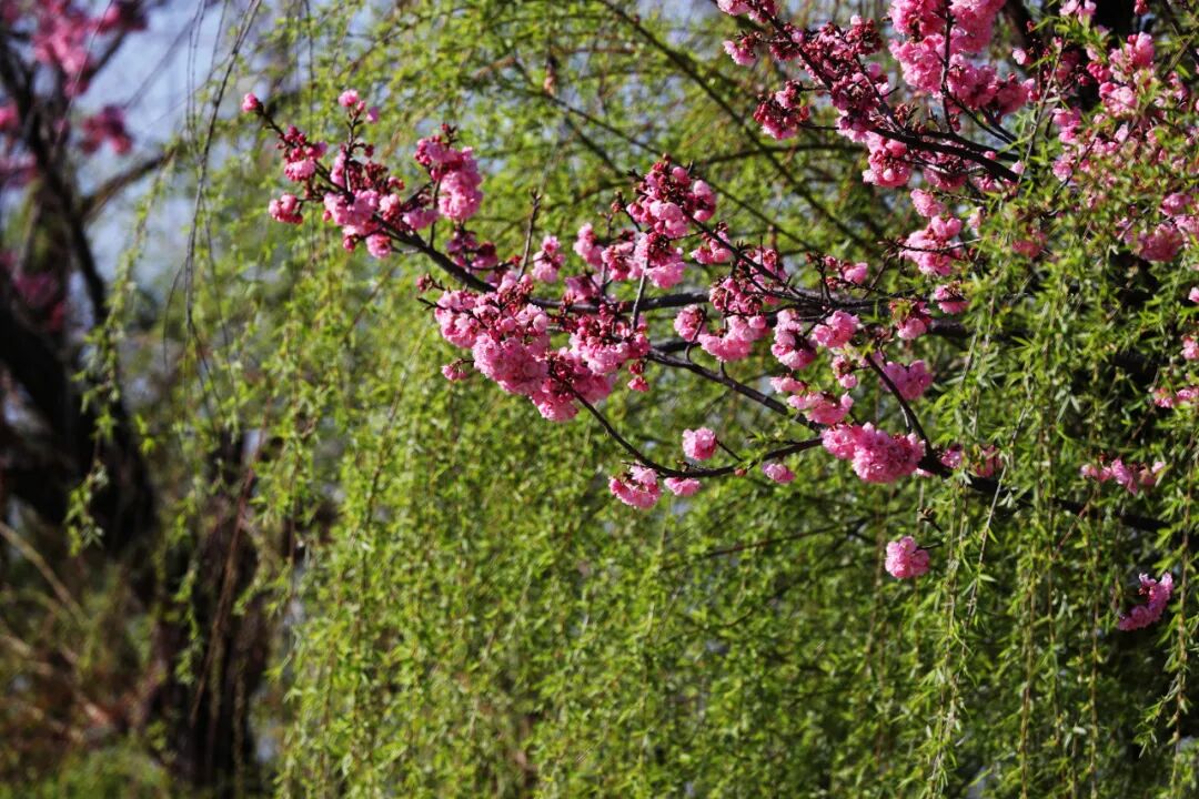 柳叶的淡淡绿意之间,樱花粉嫩的容颜显得愈发娇艳,绽放的花朵随着枝条延伸,时密时疏,浓淡各异,美得那么清新脱俗。层层叠叠的花瓣包裹着花蕊,在枝头聚成一团,远观,近赏,各有不同的美感。