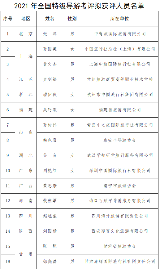 附件:2021年全国特级导游考评拟获评人员名单