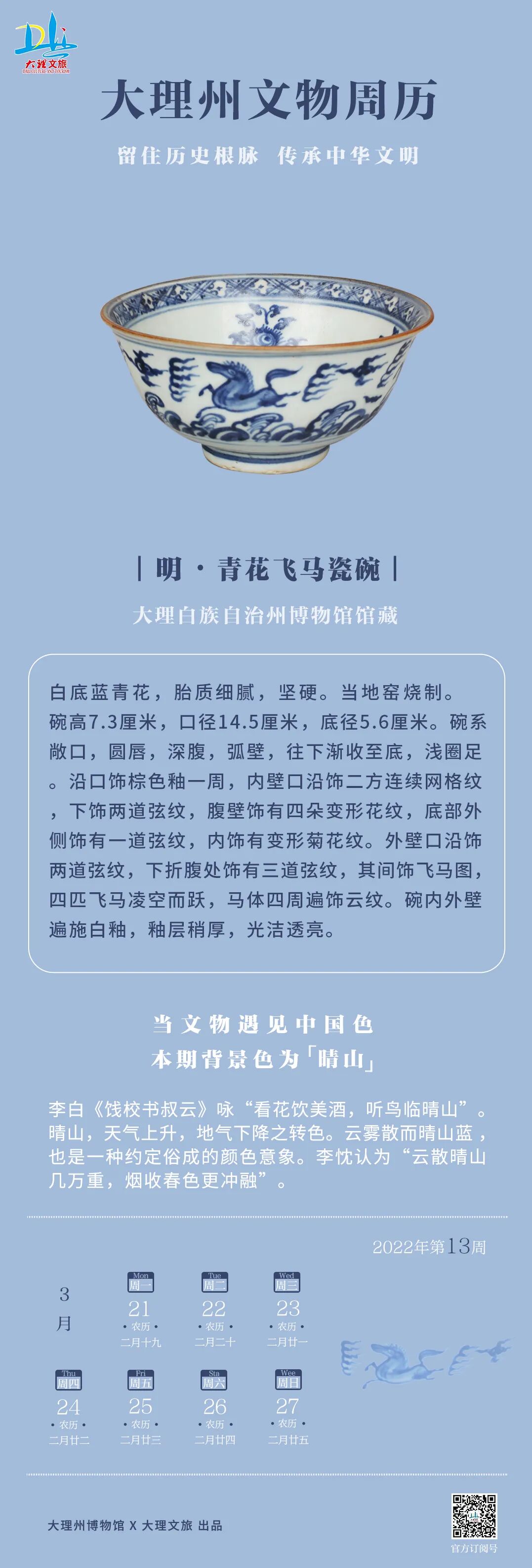 文物周历,通过文物与周历、中国传统色相融合的创意设计,让观众一周见一样大理文物,一周见一种中国传统颜色,在感受时光变化,了解大理文物的同时,看见中国传统文化之美。