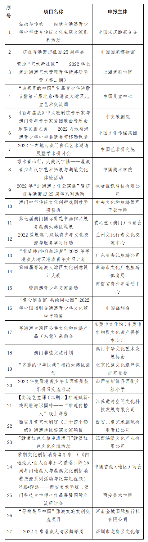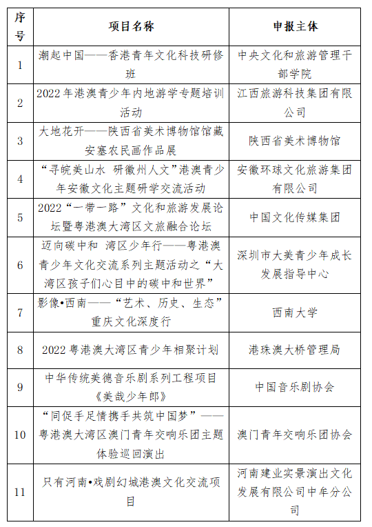 2022年度内地与港澳文化和旅游交流重点项目公示名单